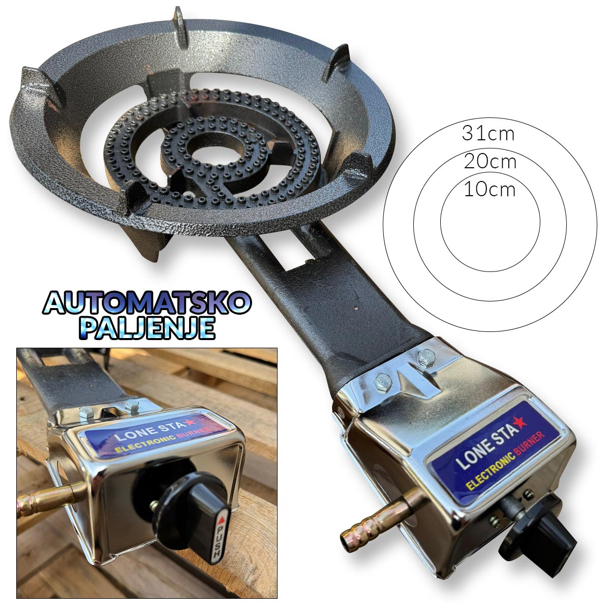 Profesionalni gusnati plinski plamenik s automatskim paljenjem na iskru, idealan za kućnu i profesionalnu upotrebu. Zahvaljujući trostrukom krugu plamena (Ø31 cm, Ø20 cm, Ø10 cm) osigurava ravnomjerno raspoređenu toplinu i mogućnost prilagodbe jačine vatre prema potrebama.